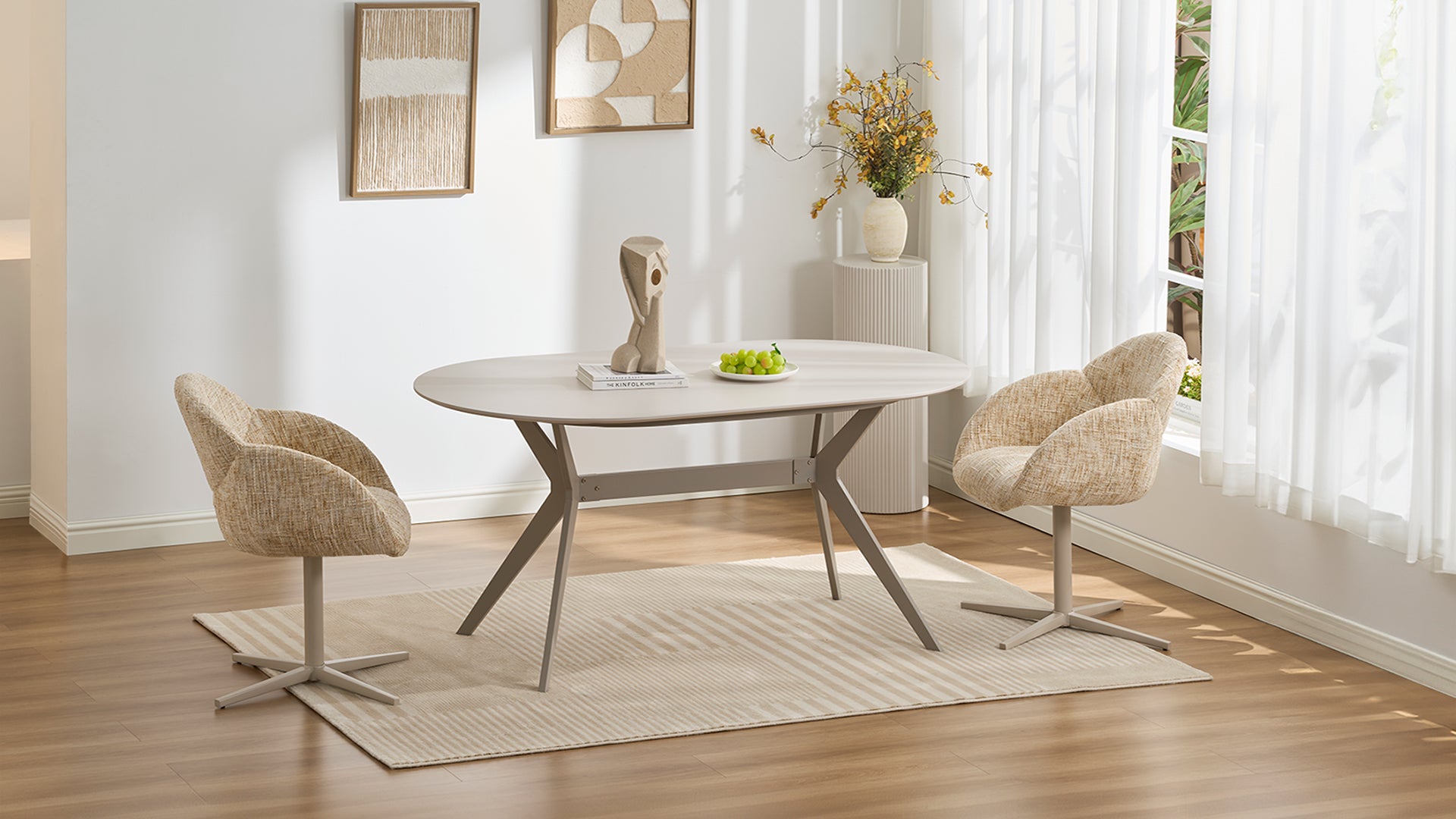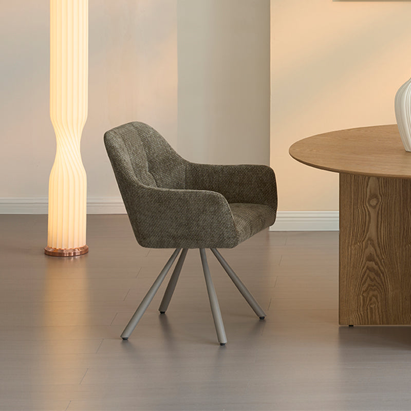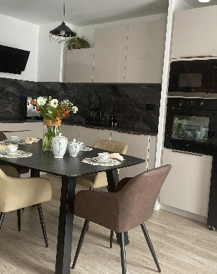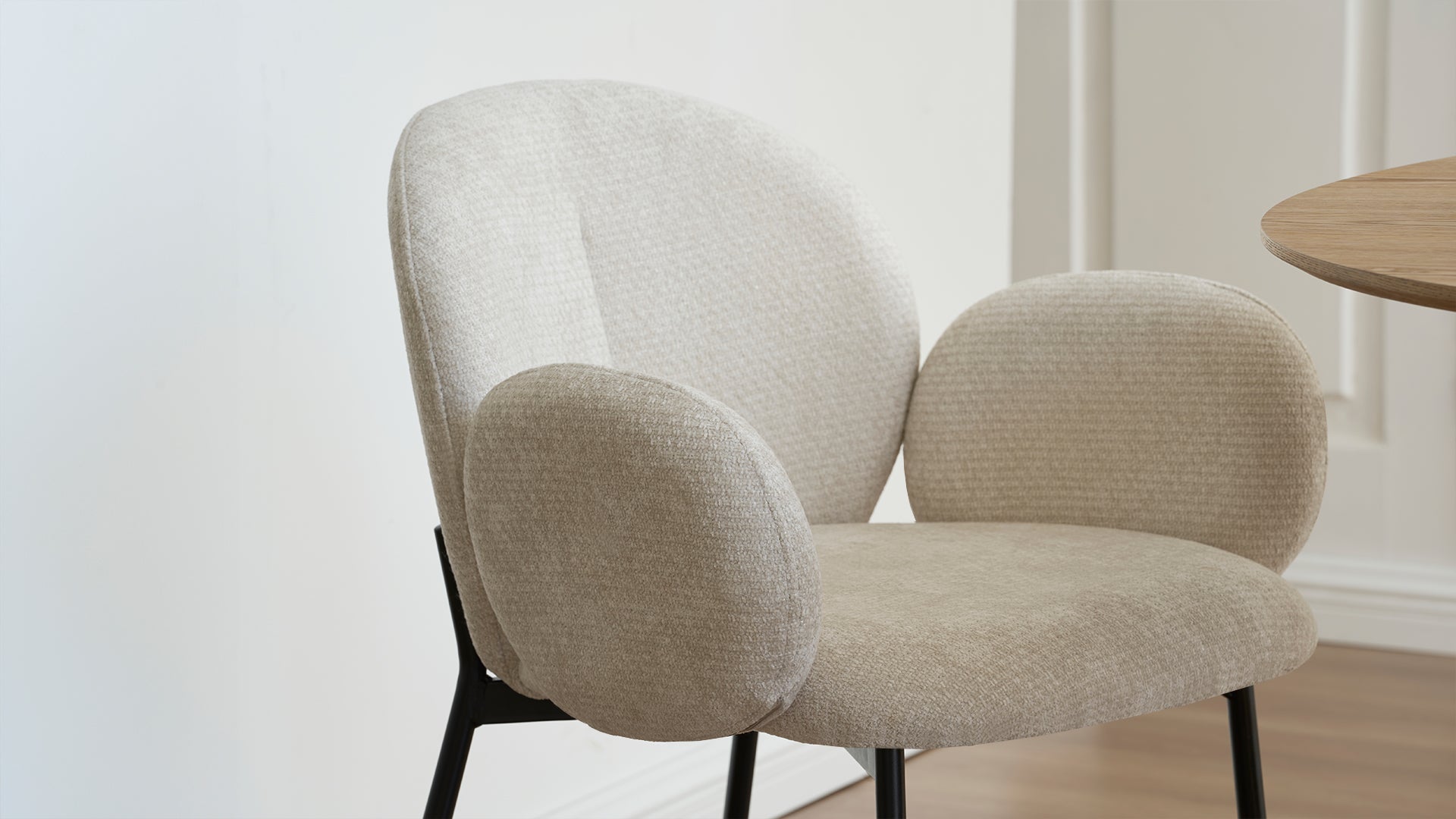 Dankzij de brede, licht gebogen rugleuningen en luxueuze linnen stof brengen de Karin stoelen van OFCASA de sfeer van een boetiekhotel rechtstreeks bij u thuis.