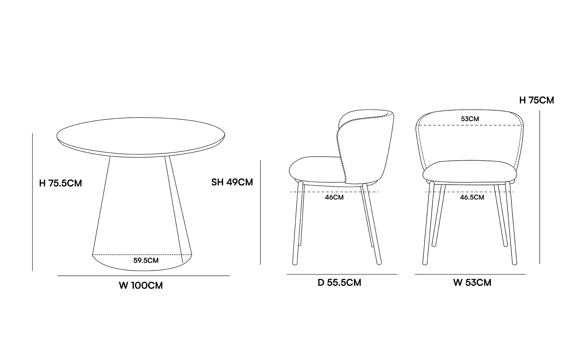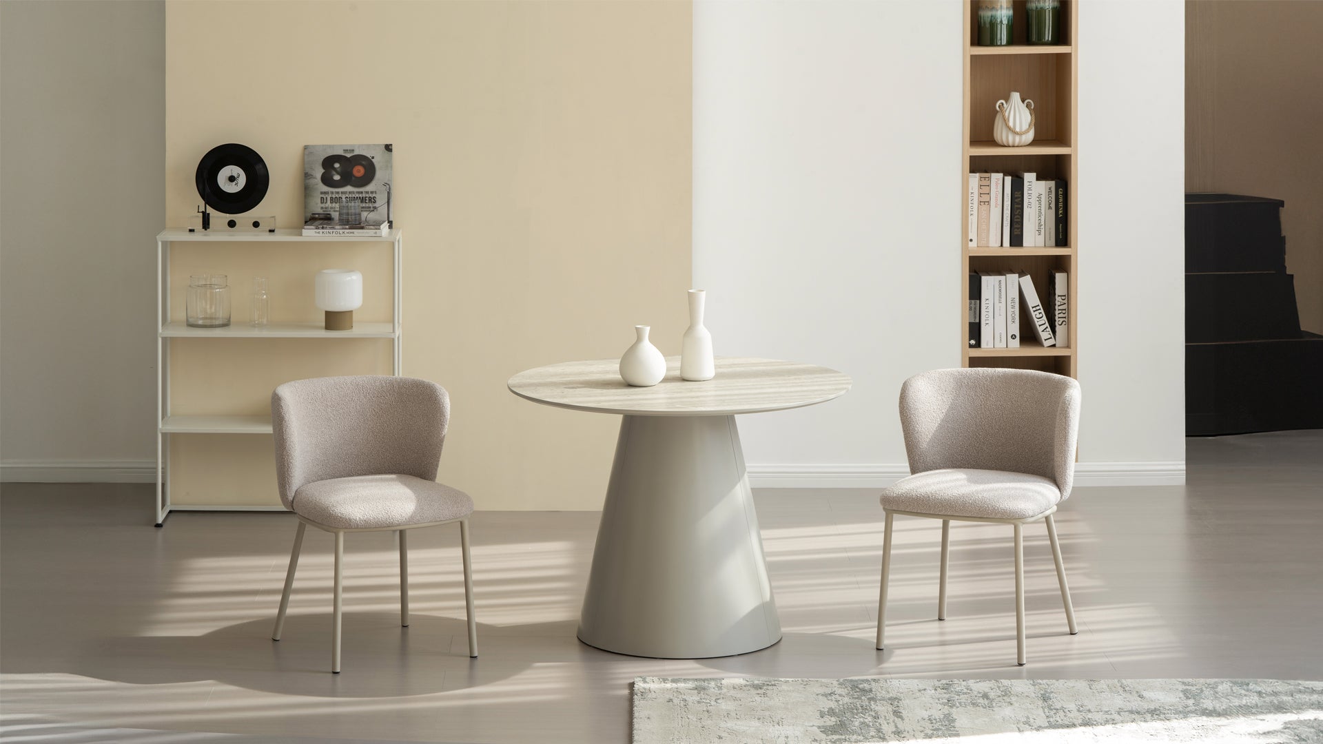 Creëer een moderne en uitnodigende eetkamer met de Elowen ronde tafel en Karin stoelen. De Elowen tafel (100 cm in diameter) is perfect voor intieme diners of kleine bijeenkomsten. Het ronde ontwerp stimuleert gesprekken en bespaart ruimte, waardoor hij ideaal is voor kleine appartementen of stijlvolle keukens.