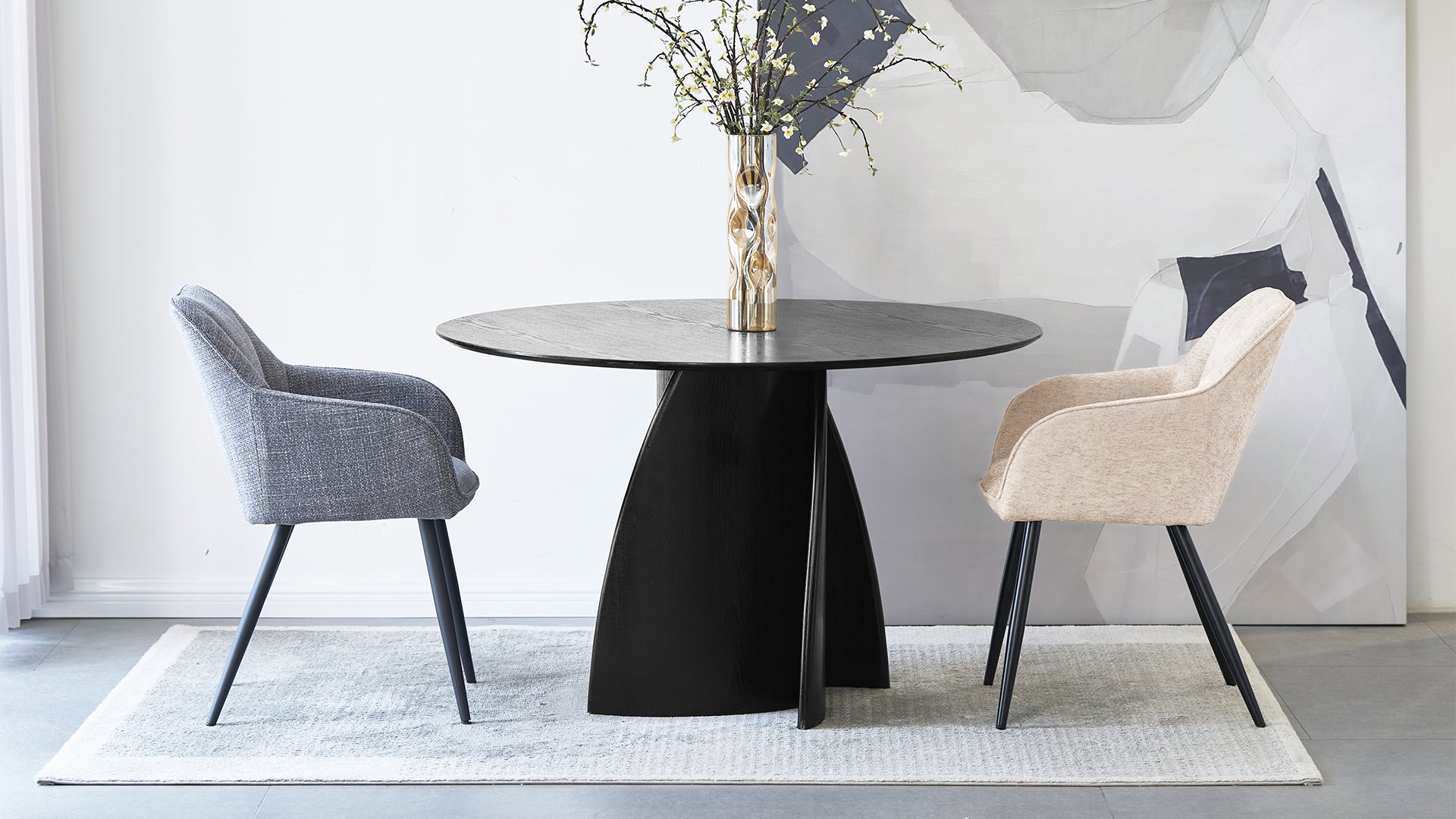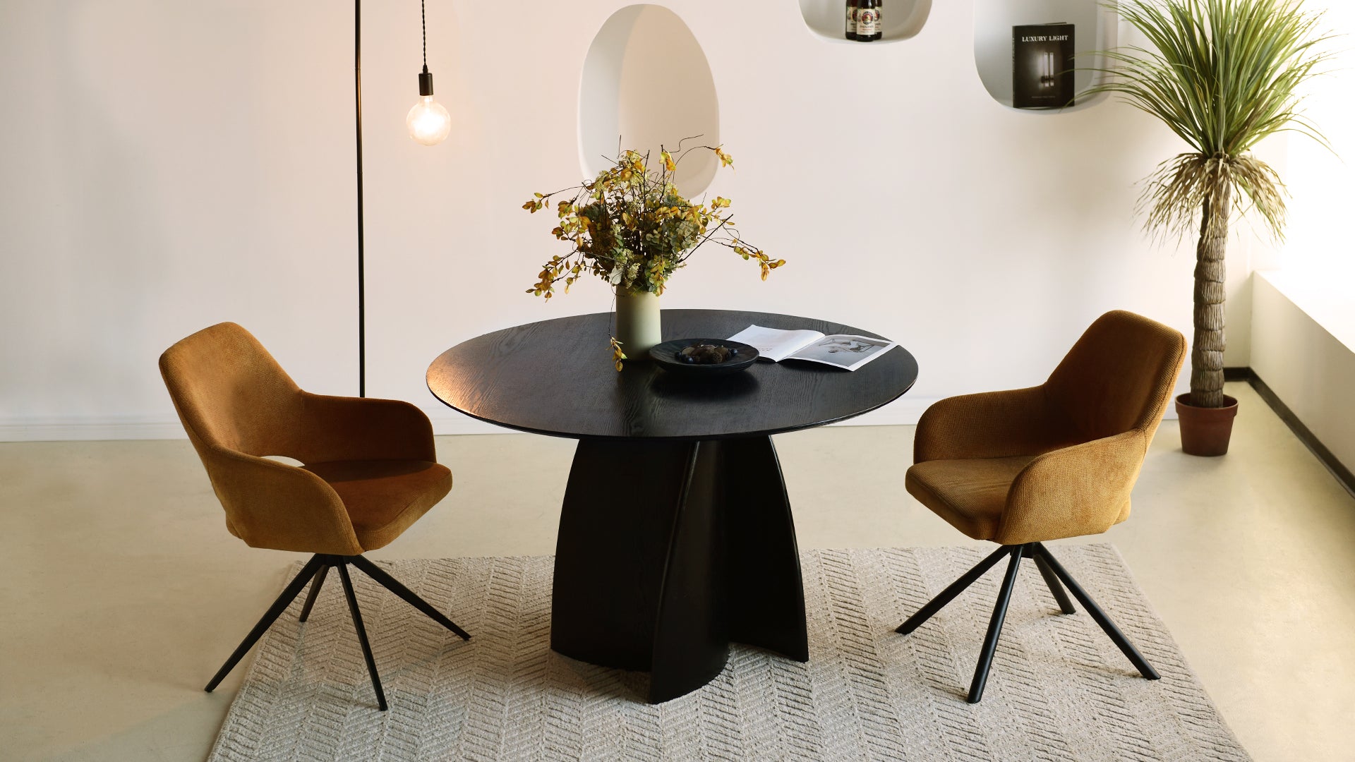 Bevestig uw unieke stijl met de ronde tafel Gemma, waarvan de zwarte en natuurlijke houten bekleding direct het karakter van uw eetkamer of open woonkamer versterkt. Met een diameter van 120 cm biedt deze tafel comfortabel plaats aan vier personen. De ronde lijnen passen perfect in zowel een modern stadsappartement als een rustieke keuken in Scandinavische stijl.