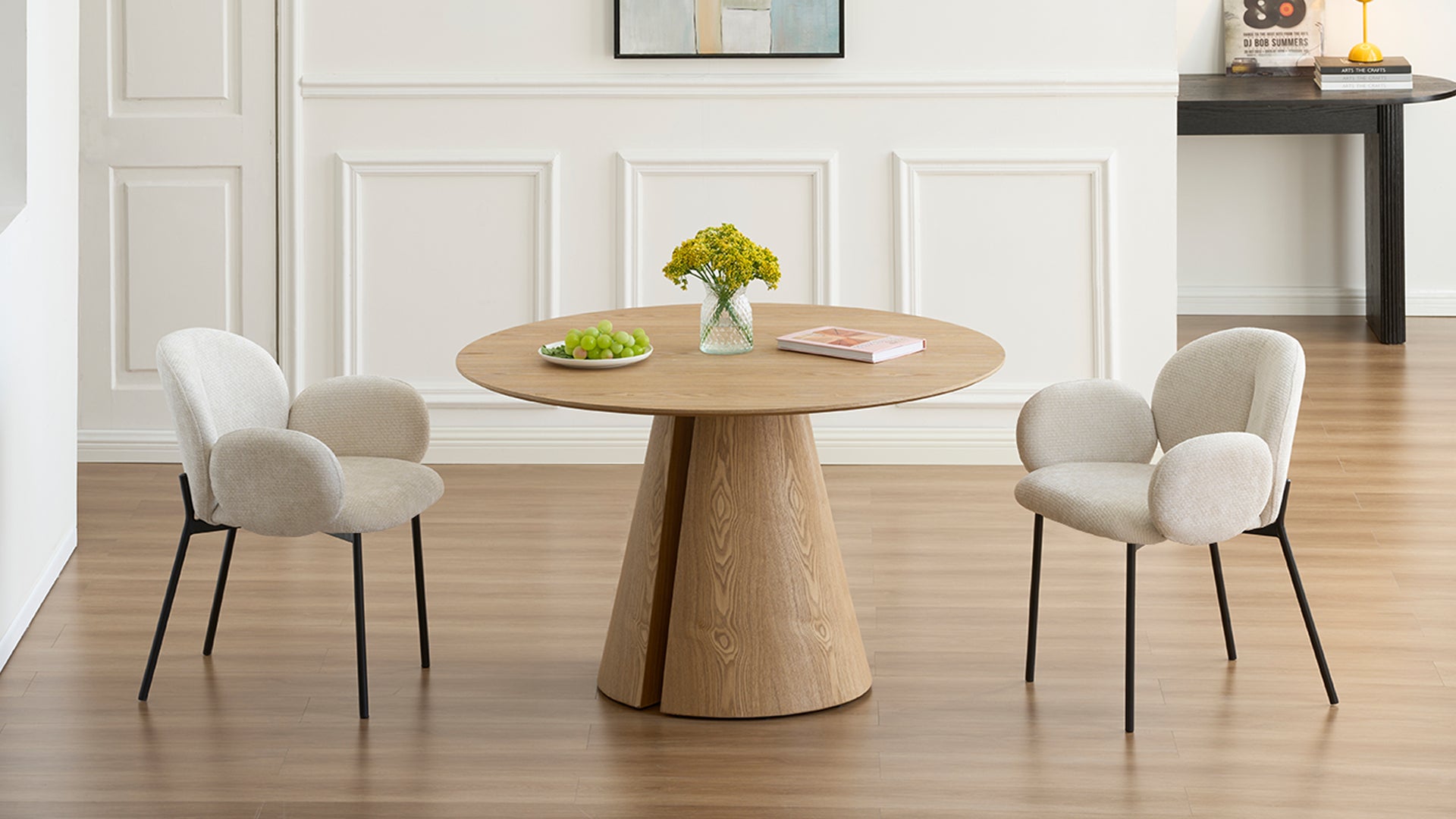 De solide tafel met een diameter van 120 cm biedt volop ruimte voor gezelligheid, terwijl de elegante, pluche stoelen met zachte vulling en armleuningen zorgen voor ontspannend comfort. Het perfect op elkaar afgestemde ontwerp in warme, natuurlijke tinten brengt een vleugje moderne, rustieke charme in uw huis.