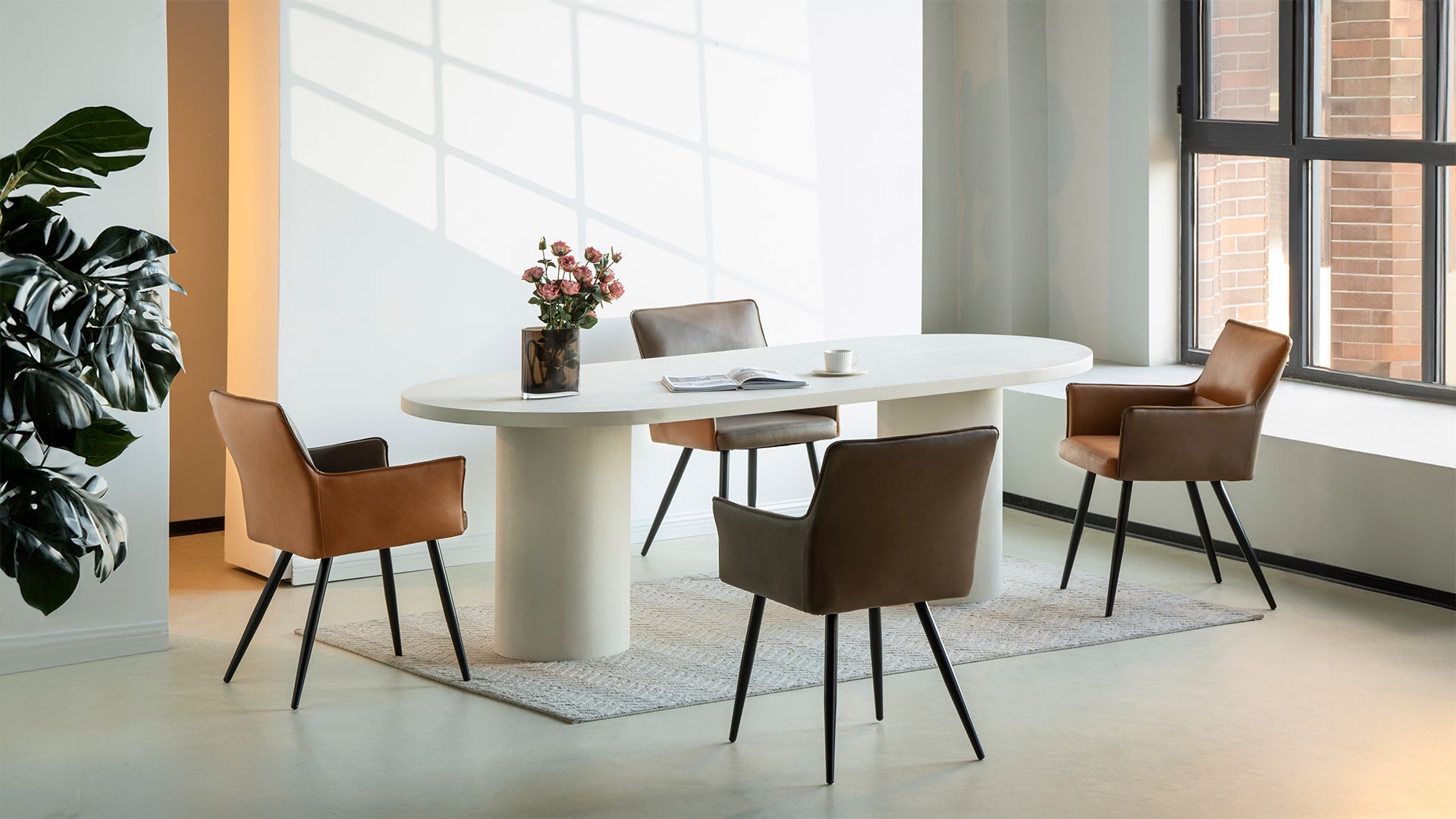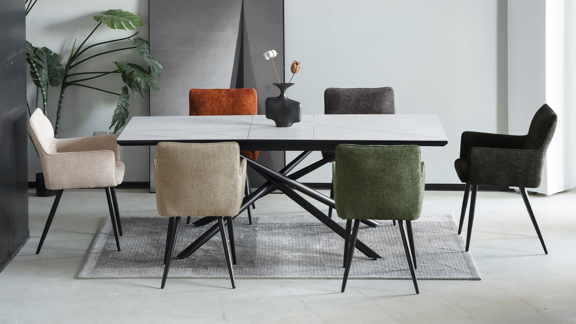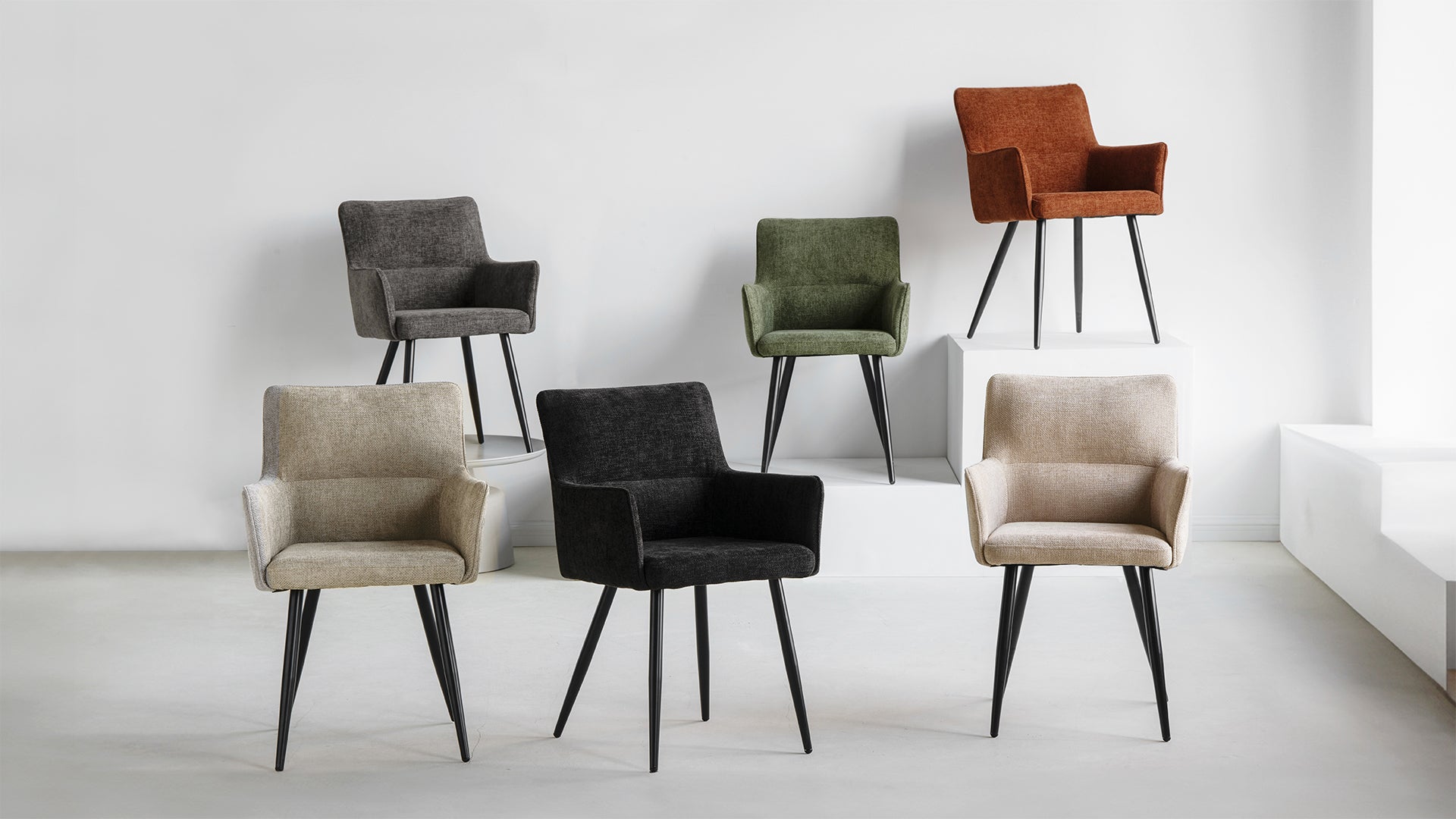Ontdek de OFCASA Kaya eetkamerstoelen, bekleed met een zachte linnen stof voor een casual maar elegante look. Met hun subtiele stiksels en moderne lijnen zijn deze stoelen perfect voor de inrichting van een stadsappartement of een cottage op het platteland.