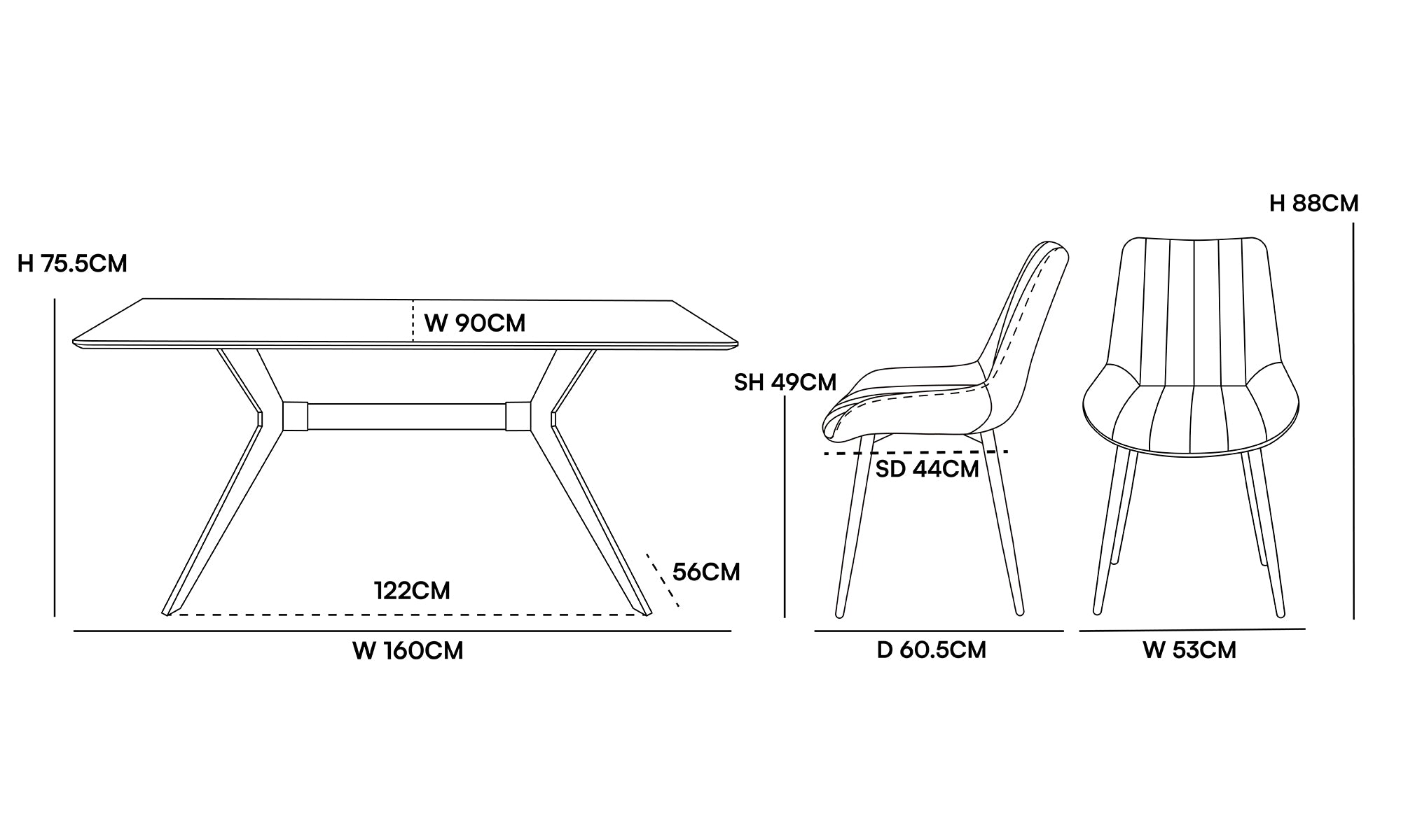 Verrijk uw eetervaring met de rechthoekige eettafel Laila (160 cm x 80 cm) en zes Jarvis eetkamerstoelen, een perfecte mix van stijl, comfort en functionaliteit.