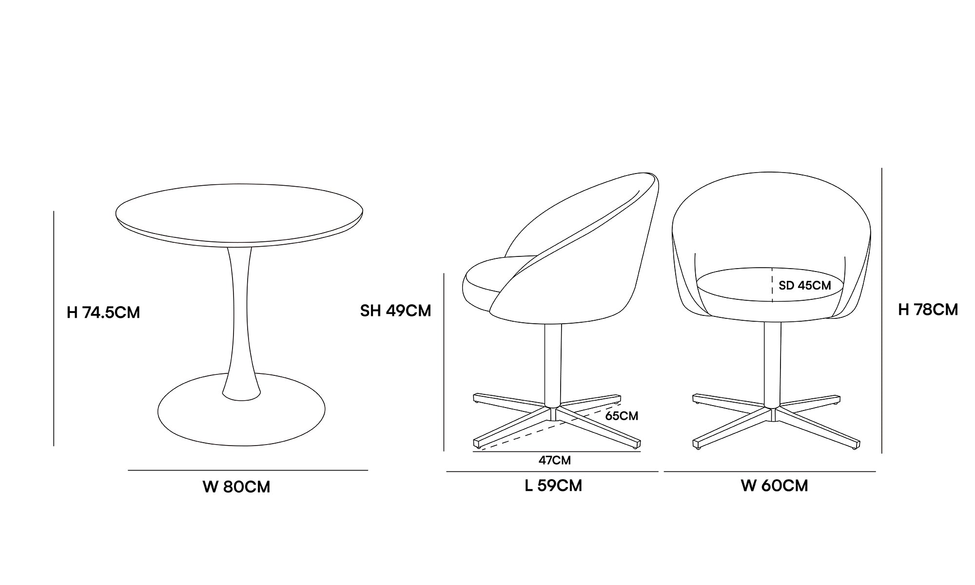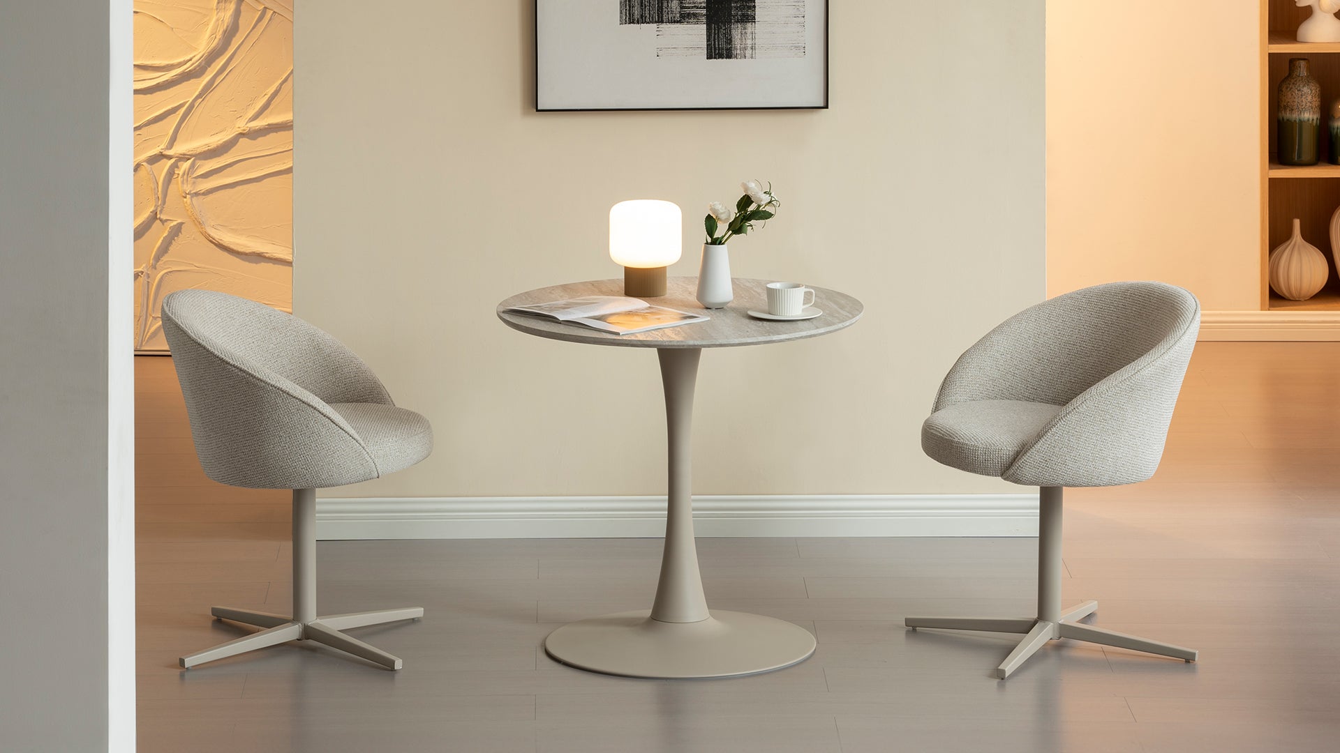 De stoelen zijn bekleed met linnen en draaien 360 graden, wat een vleugje moderniteit toevoegt aan het geheel. De dikke kussens en strakke armleuningen combineren comfort en esthetiek, waardoor het de ideale keuze is voor een romantisch diner voor twee of een eenvoudige maaltijd voor twee.