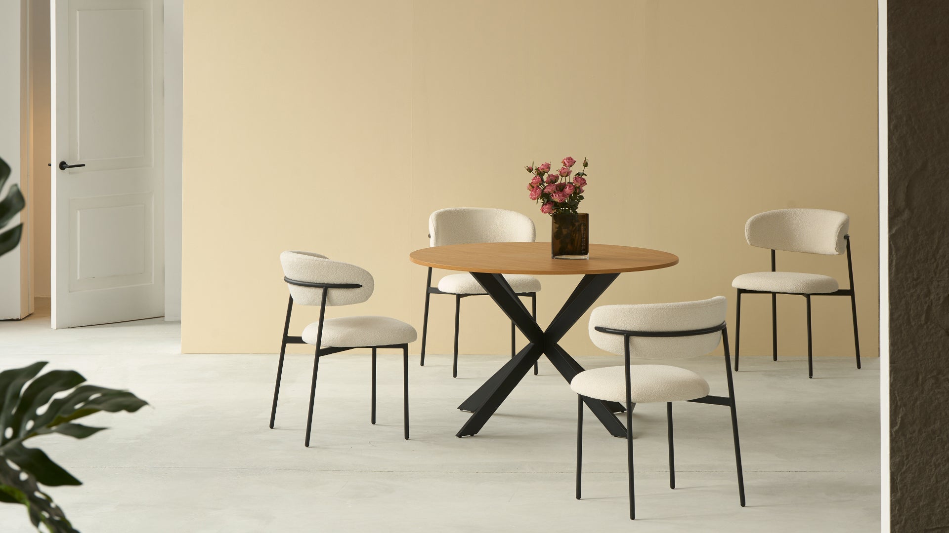 Het grote oppervlak biedt gemakkelijk plaats aan familiediners, werk of weekendbrunches. De Zahra-stoelen, bekleed met een luxueuze boucléstof, combineren zachtheid en duurzaamheid. De brede, gebogen rugleuning en licht gewatteerde zitting zorgen voor optimaal comfort, terwijl de slanke zwarte stalen poten de tafel harmonieus complementeren. Elke stoel kan tot 150 kg dragen en combineert stevigheid en stijl.