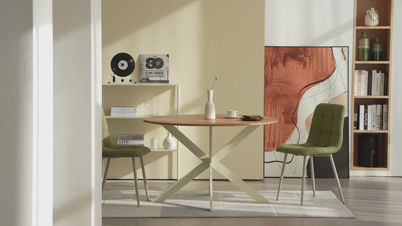 De X-vormige metalen poten geven een eigentijdse touch, terwijl het stevige frame de tafel en vier stoelen stabiel houdt, zelfs tijdens levendige gesprekken. Het melamine oppervlak is gemakkelijk schoon te maken, waardoor hij ideaal is voor dagelijks gebruik.